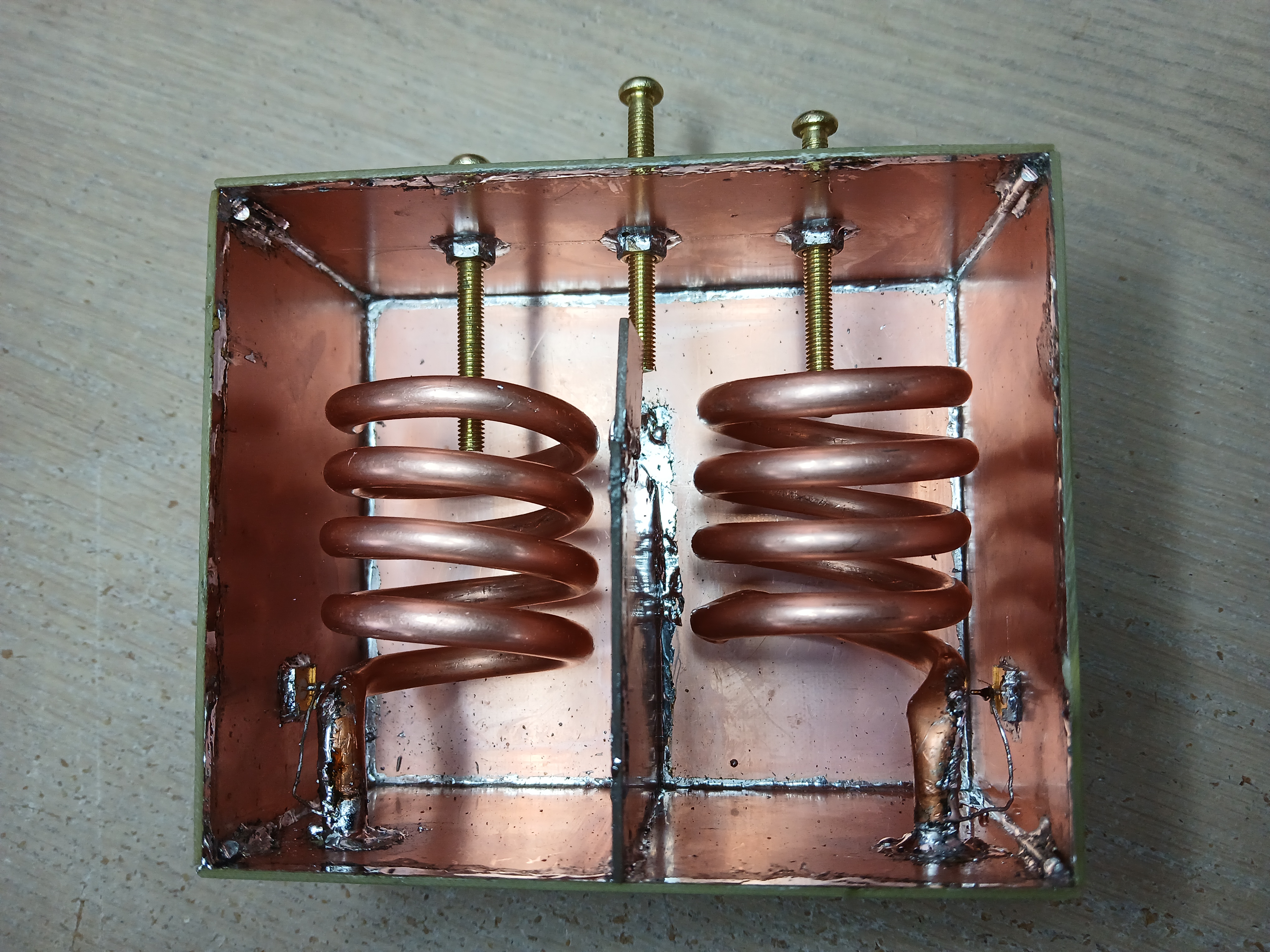 I tried to make all dimensions accurate down to 0.5 mm, and took care to prevent damaging the conducting surfaces. I did not sand the PCB, and tinned the edges of the walls as little as possible since solder has lower conductivity than copper. To make the coils, I filled the tube with sand and wound it on a plastic pipe of a suitable diameter.